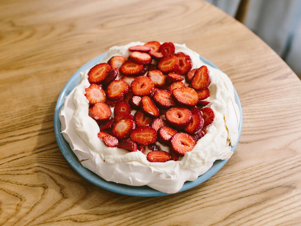 When I looked at the finished pavlova, all beautiful and angelic with bleeding blood-red strawberries, it didn’t feel much like Christmas food at all; it was pretty obvious now that food has no innate meaning subscribed to it. But I could tell that to Gordon, and even to photographer Jo Currie, that it did; that the cream on top of the light meringue, perfectly crunchy on the outside, was intertwined with happy, summery memories. It was lovely to see. “Christmas is not the same without a pavlova,” one of them mused.