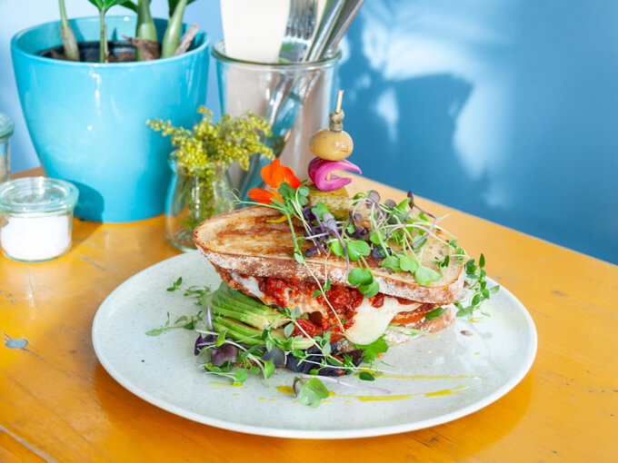 Inside, the space centres on an oblong workstation comprising the coffee machine, and “the longest cabinet we’ve ever installed,” says Aaron, which, if you’ve seen Winona Forever’s enormous offering, might astonish you. Rude Boy’s cabinet is more than two metres long and positively heaving with baked treats, salads, stuffed potatoes, sandwiches and more. If it wasn’t made of glass and marble it might collapse under the weight of itself.